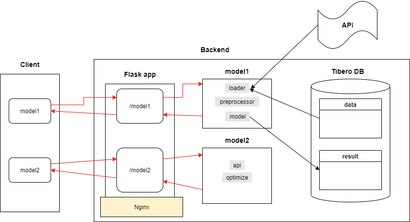 개발에 앞서 다음 그림과 같은 구조를 기획했다. Flask app server는 클라이언트의 요청을 라우팅하는 router 모듈로 동작하고, backend server는 Flask app server에서 받은 요청에 따라 그에 맞는 모델을 호출해 작업을 수행한 뒤 결과를 돌려준다.